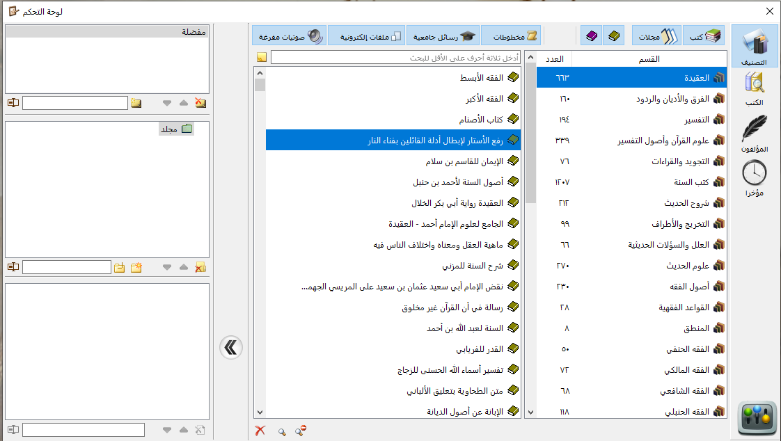 - التحكم في المفضلة، يمكن أن يكون عندك عدة مفضلات، كل مفضلة تعتبرها مكتبة كاملة تفرعها إلى أقسام كما شئت ويمكنك أن تضع الكتاب في المفضلة في أكثر من مجلد. عند البحث يمكنك اختيار مجلدات من المفضلة ضمن مجالات البحث
